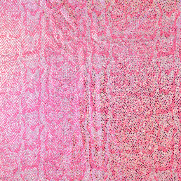 En spektakulär folietrikå med en glansig yta och ett detaljerat ormskinnsmönster. Tyget är mjukt och stretchigt tack vare elastaninnehållet, vilket gör det perfekt för scenkläder, dansdräkter, festkläder och accessoarer.