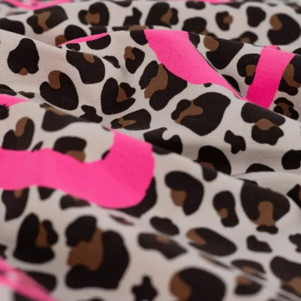 <ul><li>French terry med stretch</li><li>160 cm bred, 235 g/m²</li><li>Leopardmönster med neonhjärtan</li></ul>