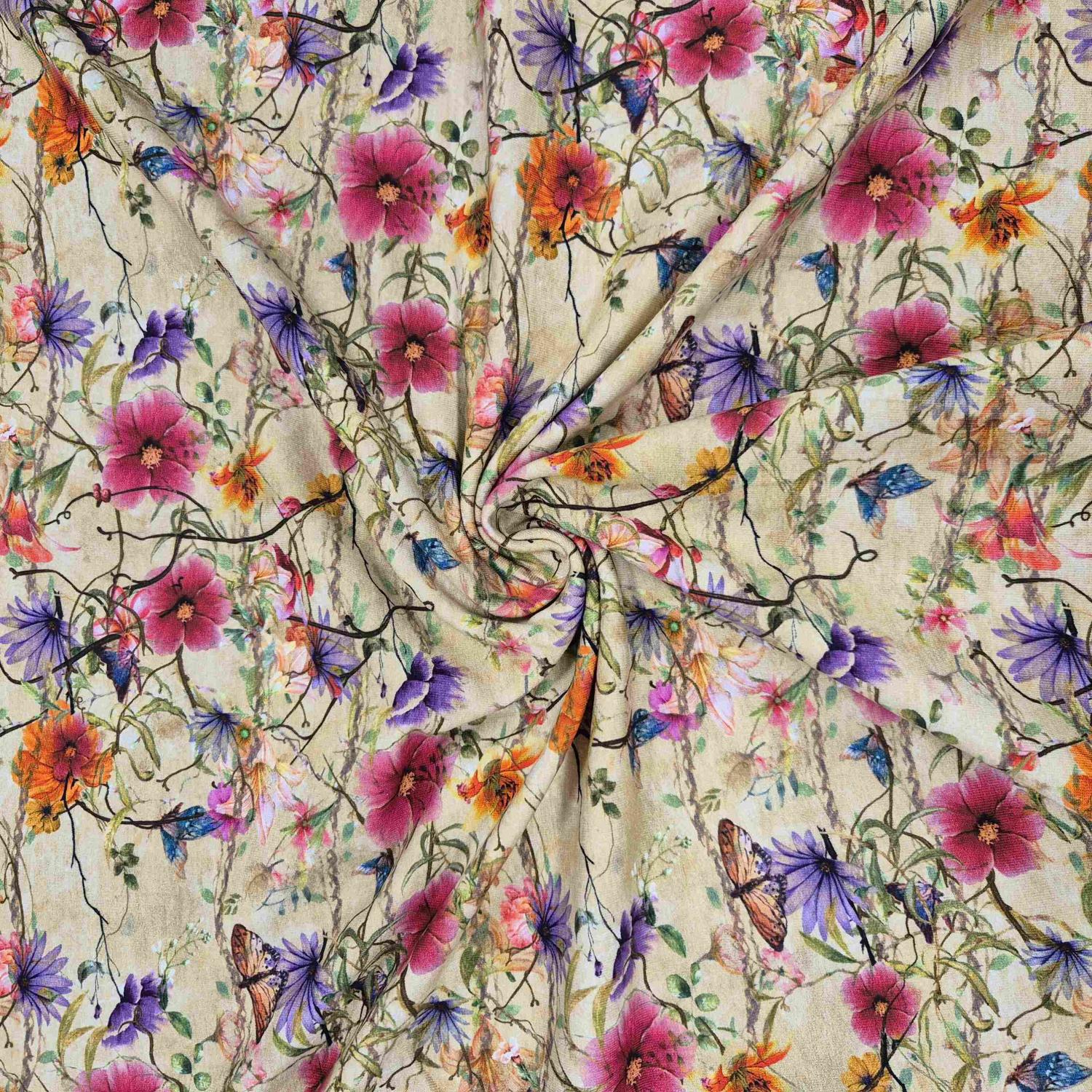 Ett mjukt och följsamt french terry-tyg med ett romantiskt mönster av blommor, fjärilar och slingrande växtlighet. Trycket för tankarna till en blommande sommaräng – perfekt för dig som vill skapa något drömskt, färgstarkt och bekvämt.