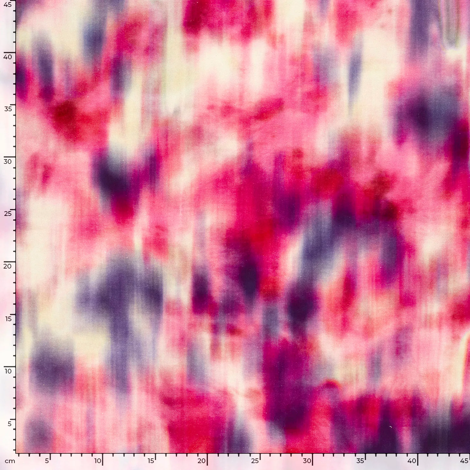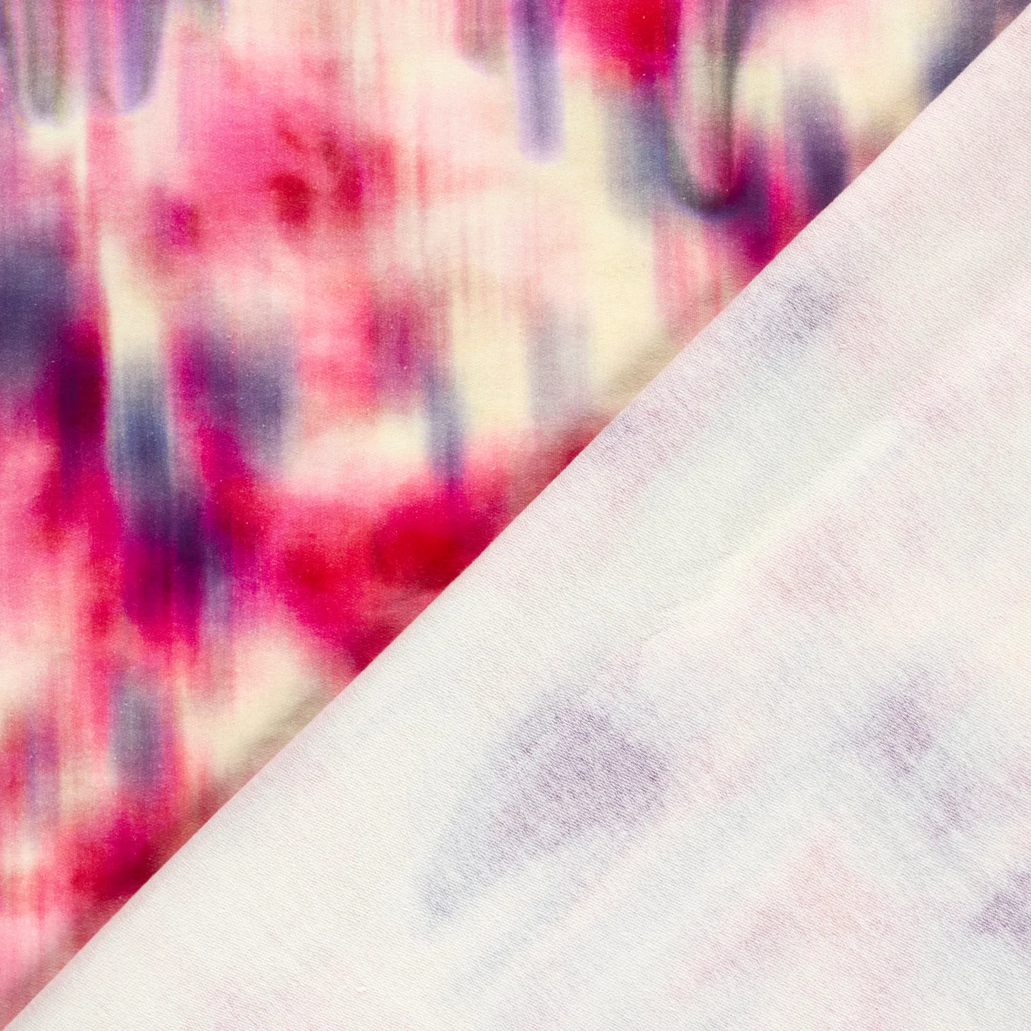 Mjuk french terry med ett digitaltryckt abstrakt mönster i fuchsia, lila och cremevita toner. Mönstret påminner om akvarellpenseldrag eller tie-dye och har en suddig, drömsk karaktär som ger tyget rörelse och liv. French terry har en slät rätsida och en mjuk loopvävd avigsida som ger värme och absorberar fukt. Tyget passar utmärkt till mysbyxor, sweatshirts, klänningar, hoodies och barnkläder.