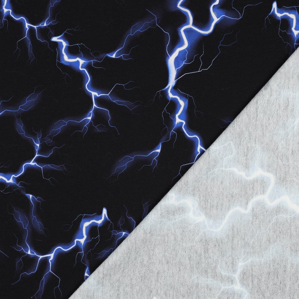 Ett uttrycksfullt tyg i french terry med ett mönster som liknar elektriska urladdningar. Designen har stark energi och passar perfekt till plagg som ska sticka ut – oavsett om det gäller barnkläder, tröjor, hoodies eller tights.