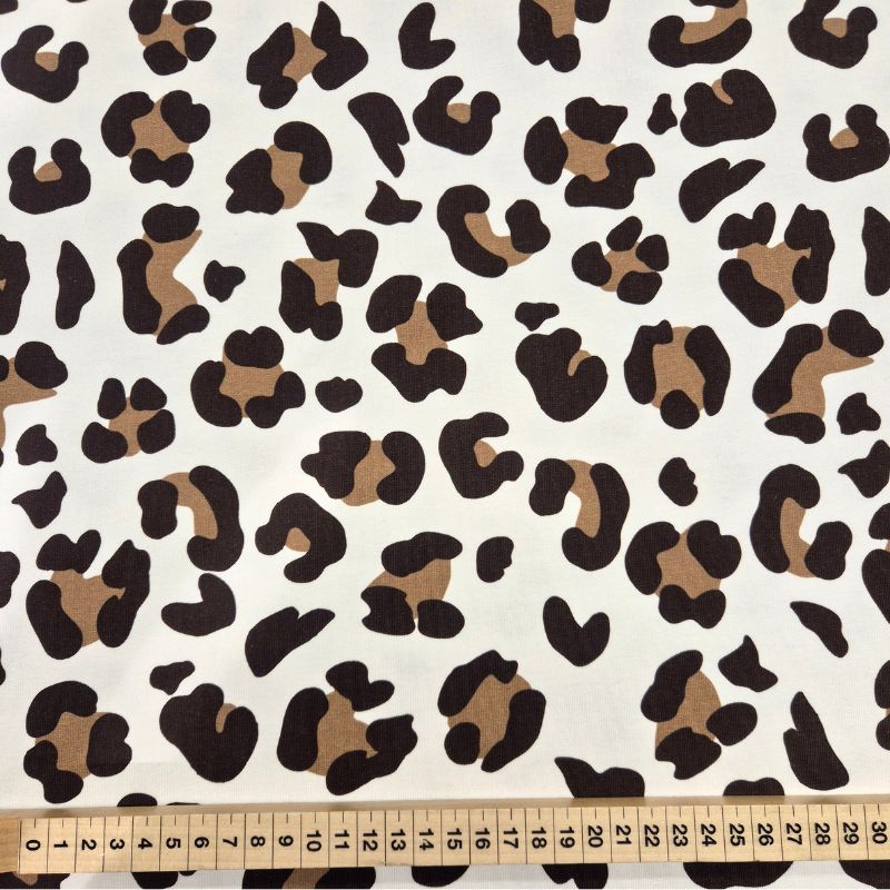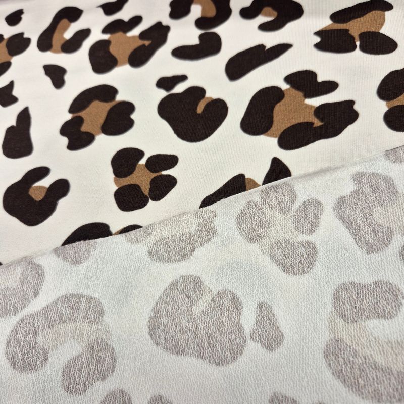 En mjuk french terry med digitaltryckt leopardmönster mot offwhite botten. Tyget har en slät rätsida och en loopig avigsida som ger värme och komfort. Med god stretch och en vikt på 250 g/m² passar det till tröjor, byxor, klänningar och bekväma vardagsplagg för både barn och vuxna.