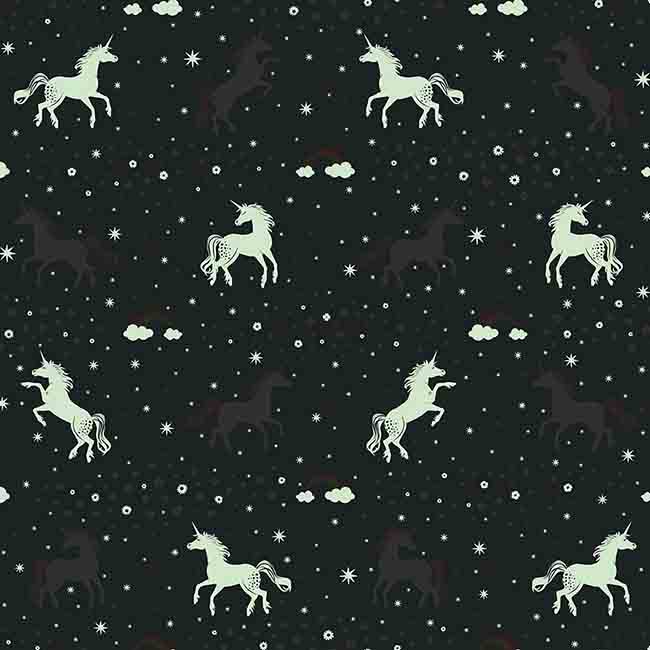 Mönster: Stjärnor med enhörningar - ett magiskt motiv av små stjärnor och lekfulla enhörningar som lyser i mörkret.