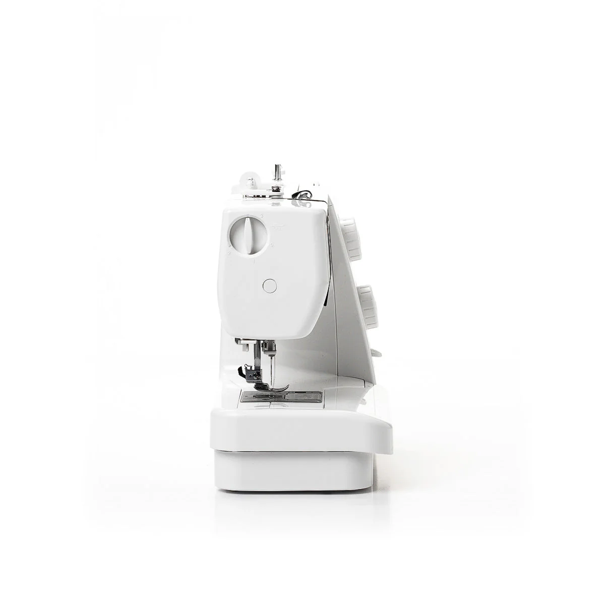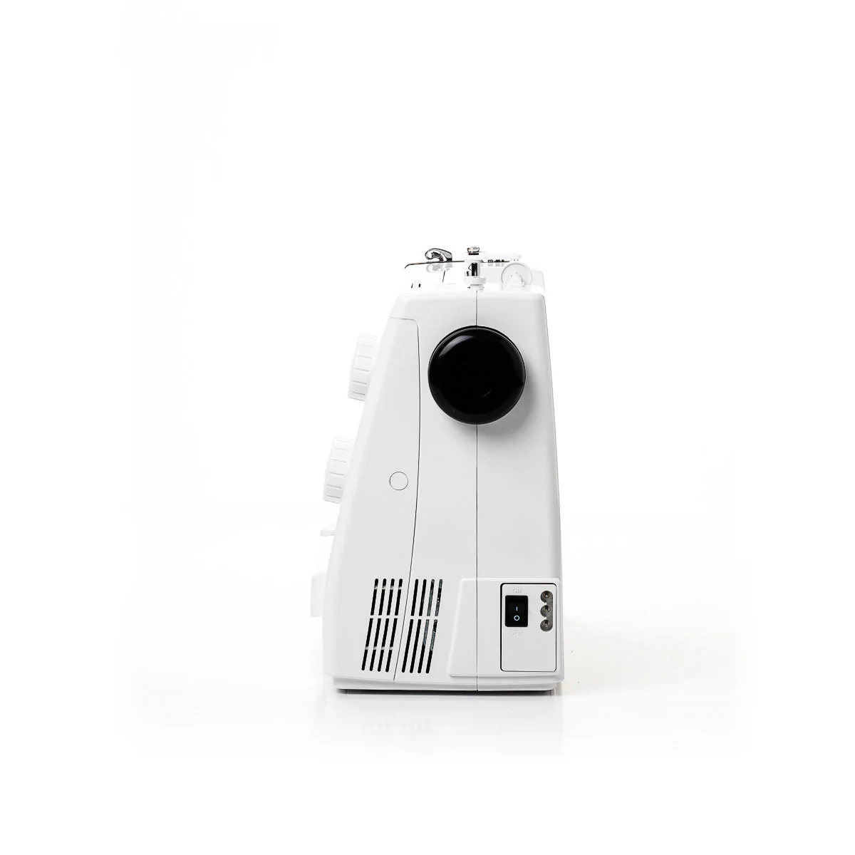 5-delad matare (Superior Feed System) ger jämn matning från tunna tyger till flera lager. Liggande spolsystem som inte trasslar. Nålpåträdare. Trådspänning justeras med ratt. Numrerad trädväg gör trädningen enkel. Extra högt pressarfotslyft för tjocka material. Matarsänkning för frihandstekniker och knappsömnad. Tvillingnål 2–4 mm. Trådavskärare på vänstra sidan. Friarm. 1 LED. 860 stygn per minut. 8 kg.