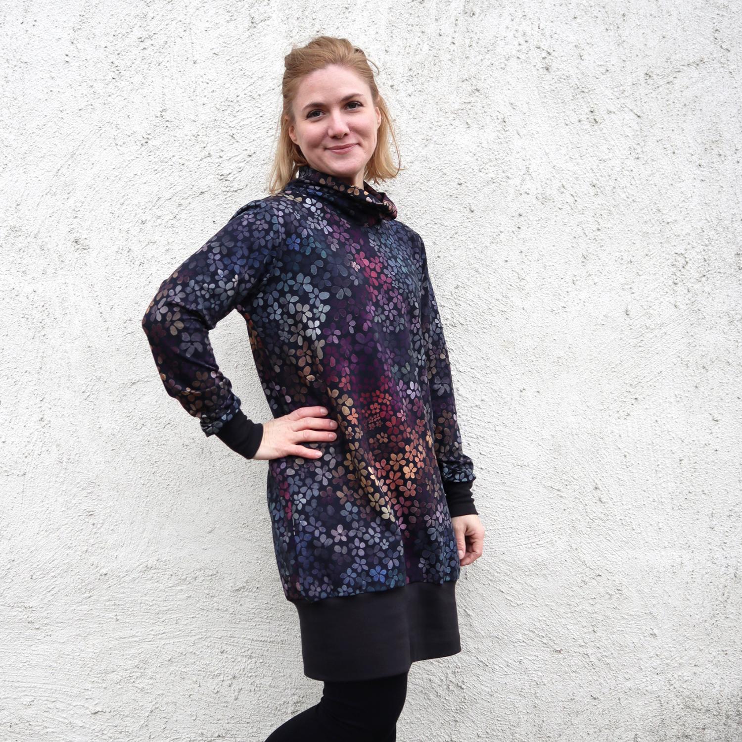 Du kan sy modellen lång eller kort, med eller utan ficka, med huva, hög hals eller ribbkant i halsen. Passformen är avslappnad och modellen lämpar sig för flera typer av stickade tyger, som bomullsjersey, isoli och punto. Ett genomarbetat mönster som fungerar lika bra till vardagsplagg som till mer personliga projekt.