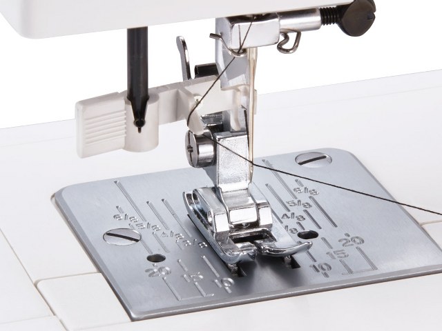 Stygnplåten, spolluckan och friarmen är utrustade med tydliga hjälplinjer i både centimeter och inch, vilket underlättar precisionssömnad och fållning. En ljusstark LED-lampa lyser upp arbetsområdet, så att du enkelt kan hantera detaljer även i svagt ljus.