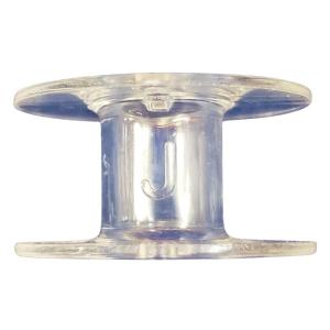 Orginalspole i plast med "J"-markering inuti. Lägg märke till att det endast är spolar med detta “J” som Janome rekommenderar till sina symaskiner. Det finns många kopior på marknaden som är tunnare i plasten och som kan vibrera och påverka stygnkvalitén.
