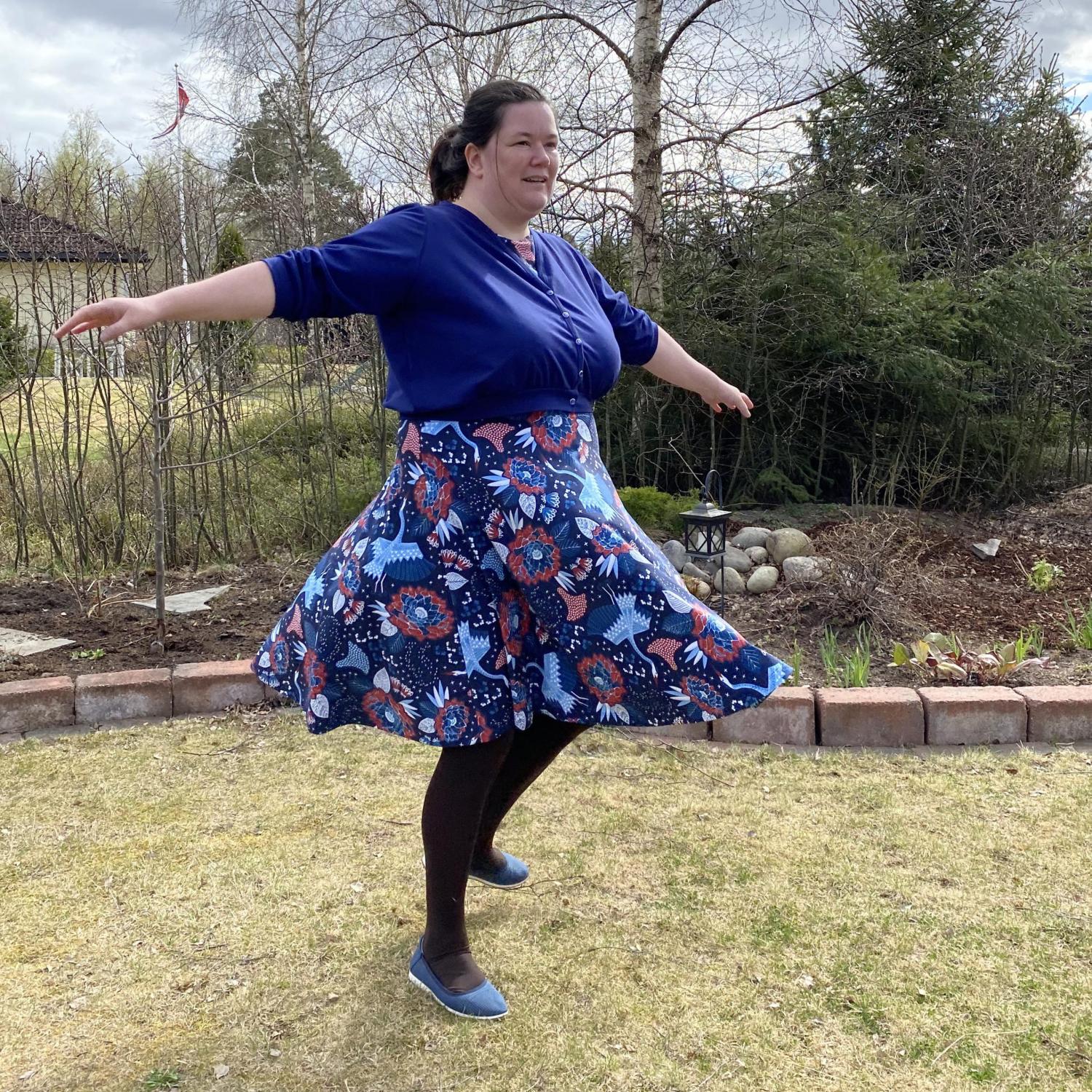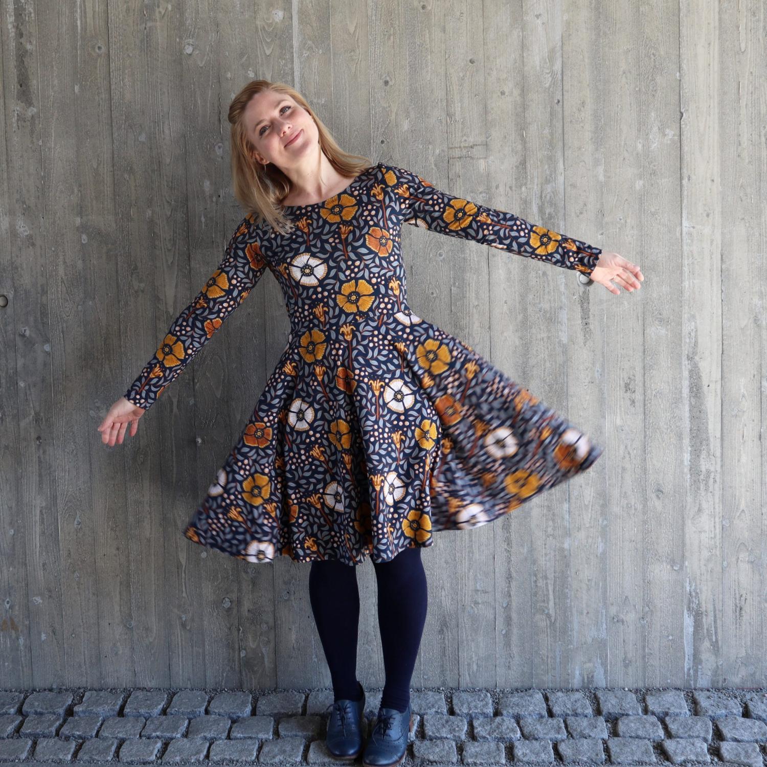 Den har en figurnära överdel och ett rikt svängande kjolparti, vilket ger vackert fall och rörelse i varje steg. En modell som klär de flesta och enkelt kan varieras för både vardag och fest.