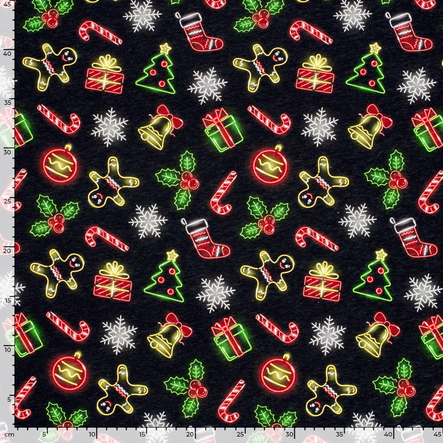Svart Digitaltryckt Joggingtyg med Ornament är en del av vår julkollektion av jerseytyger. Detta mjuka och bekväma tyg har en bredd på 140 cm och en vikt på 280 g/m². Det är tillverkat av 90% bomull och 10% polyester, vilket gör det både slitstarkt och stretchigt. Perfekt för att skapa jultröjor, myskläder eller andra plagg. Tyget är certifierat enligt Oeko-Tex Standard 100, produktklass I, och kan tvättas i 30 grader.