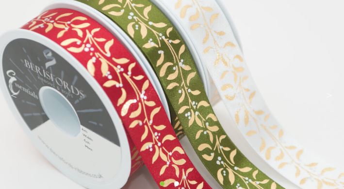 Julband Berisford Mistletoe Wishes är ett festligt band dekorerat med en vacker girlang av gyllene mistelbär och blad, vilket skapar en klassisk julkänsla. Perfekt för att dekorera kransar och paketinslagning. Finns i klassiska julfärger som rött, grönt och stilrent vitt. Tillverkat av 100% återvunnen polyester och vävt i Storbritannien.