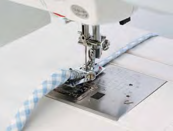 Kantbandsfoten används till att guida och sy fast kantband i ett enda moment. Bandet behöver vara 10-14 mm ovikt och dras sedan in i kantbandsfoten som viker bandet på mitten.