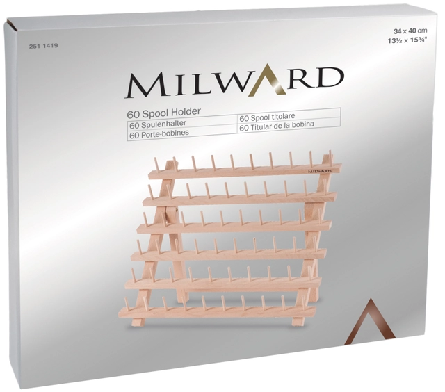 Stilren och praktisk trådrullehållare från Milward med plats för upp till 60 rullar. Perfekt för dig som vill organisera dina sytrådar överskådligt och ha rätt färg nära till hands.