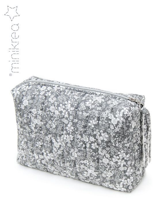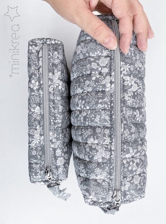 En quiltad necessär med dragkedja och mjuk, puffig form. Mönstret innehåller två storlekar, en liten och en stor, som passar som sminkväska, toalettväska eller förvaringsväska för sytillbehör och småsaker. De vertikala quiltsömmarna ger väskan en karaktäristisk puffig look.