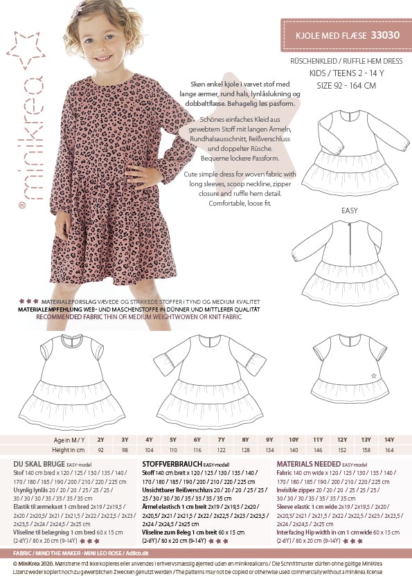 Mönstret innehåller tydliga instruktioner på danska, engelska och tyska och passar både nybörjare och vana sömmerskor. Sy klänningen i tunn eller medeltjock vävd kvalitet, till exempel bomullspoplin, linne, viskos eller tunn twill.