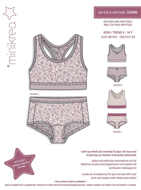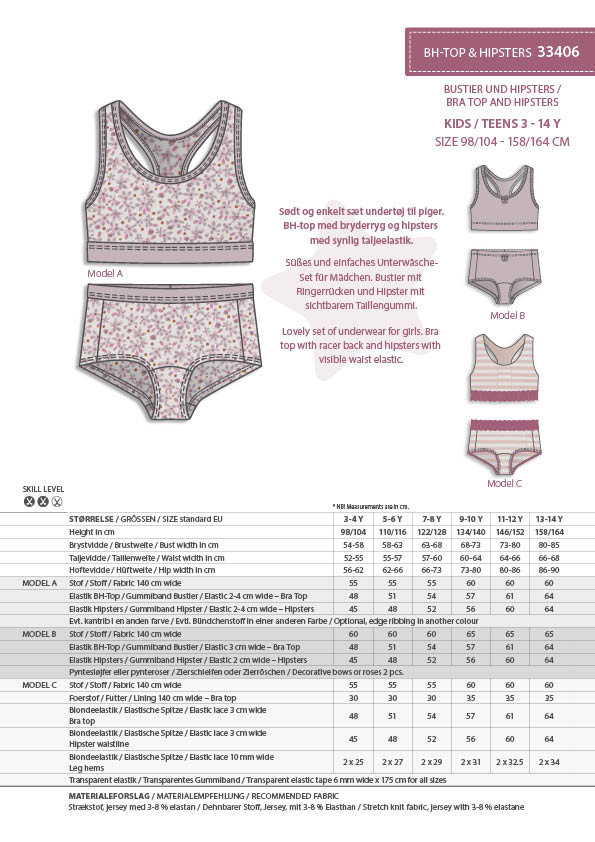 Sy i stretchig trikå med elastan, till exempel bomullsjersey. Mönstret innehåller instruktioner på danska, engelska och tyska och passar både nybörjare och vana sömmerskor.
