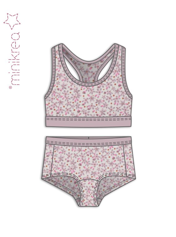 Ett fint och bekvämt underklädesset för flickor med linne och trosor. Linnet har brottarrygg och trosorna har synlig resår i midjan. Välj mellan tre olika modeller – med vanlig resår, dekorativ spetsresår eller kantband i kontrastfärg.