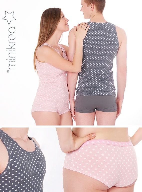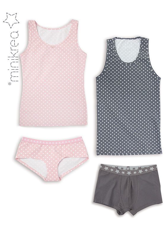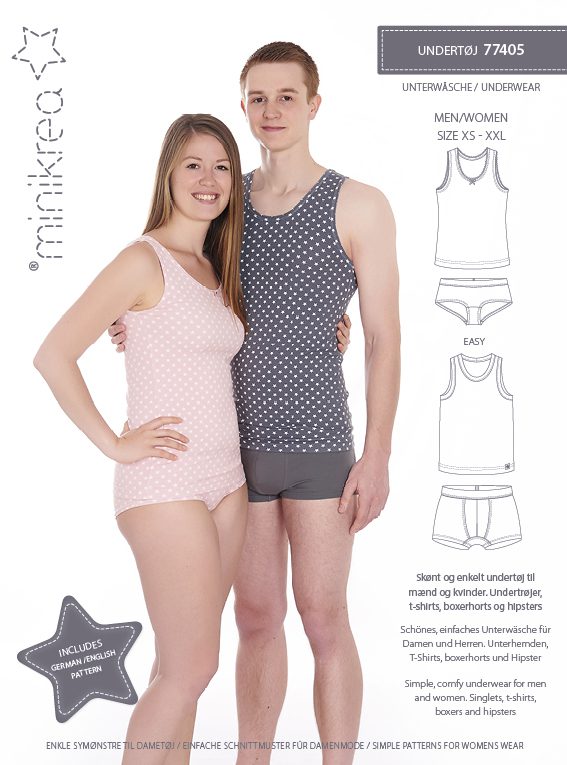 Ett symönster för underkläder till både kvinnor och män. Mönstret innehåller linne, trosor och boxershorts, allt i en enkel och bekväm modell som passar perfekt till vardags. Underkläderna sys med resår i midjan och kan anpassas efter önskad passform.