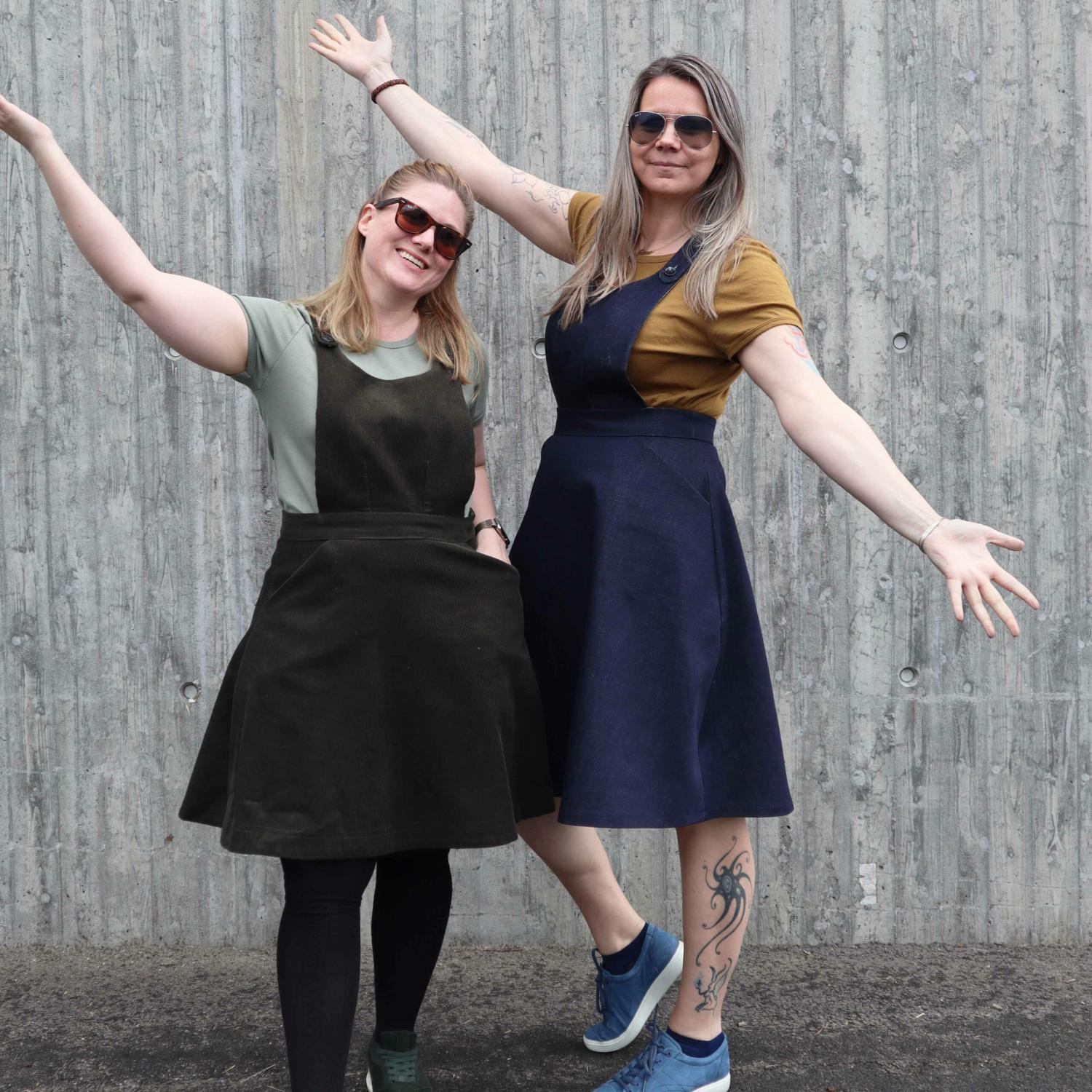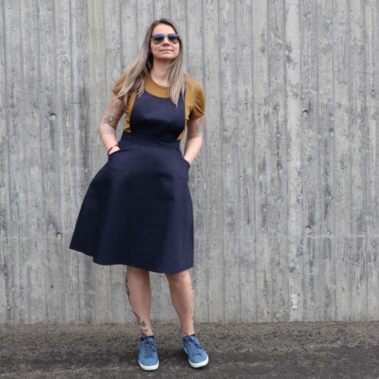 Pan Pinafore & Kjol från Ida Victoria är ett charmigt och mångsidigt mönster som låter dig välja mellan tre varianter: hängselklänning, kjol med selar eller enkel kjol.