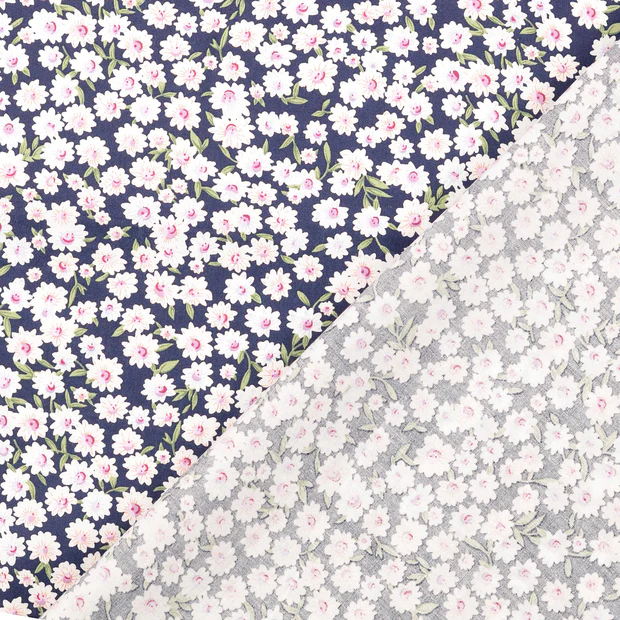 En härlig poplin i 100% bomull med ett livligt mönster av små blommor med fina detaljer, vackert spridda över en marinblå bakgrund. Denna charmiga design passar perfekt till klädsömnad, sommarprojekt och dekorativa textilier.