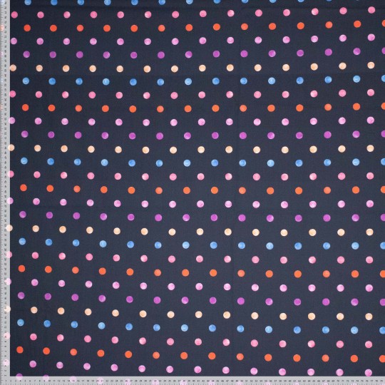 Detta vävda tyg med flerfärgade prickar på en mörk bakgrund är tillverkat av 100 % bomull och certifierat enligt OEKO-tex Standard 100. Tyget är lämpligt för olika syprojekt där ett färgglatt och prickigt mönster önskas.