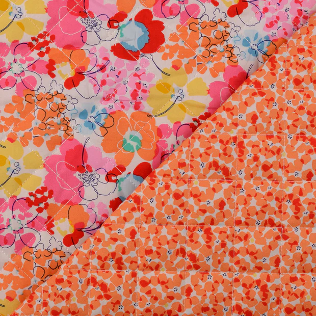 Ett vackert quiltat bomullstyg med ett livligt blommönster i rosa, rött, orange, gult och blått. Tyget är lätt men ändå fylligt, vilket gör det perfekt för vårjackor och andra kreativa syprojekt där du vill ha en mjuk och värmande känsla utan att tyget blir för tungt.