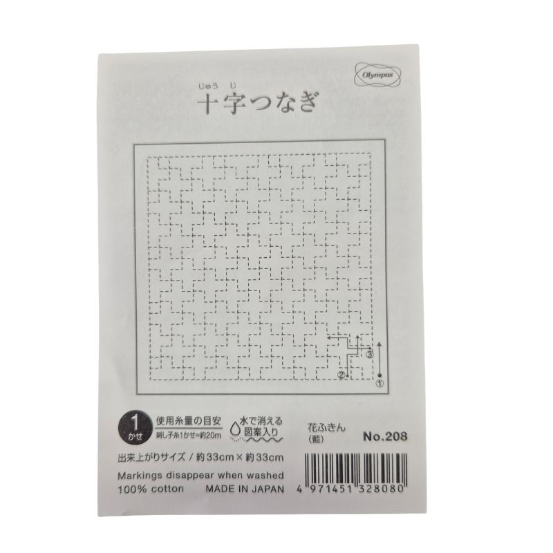 Sashikotyg med förtryckt mönster i traditionell japansk stil. Juji tsunagi (sammanlänkade kors) är ett klassiskt geometriskt motiv som sys med sashikostygn längs de tryckta linjerna. När arbetet är klart tvättas tyget så att trycket försvinner och bara de vackra stygnen framträder.