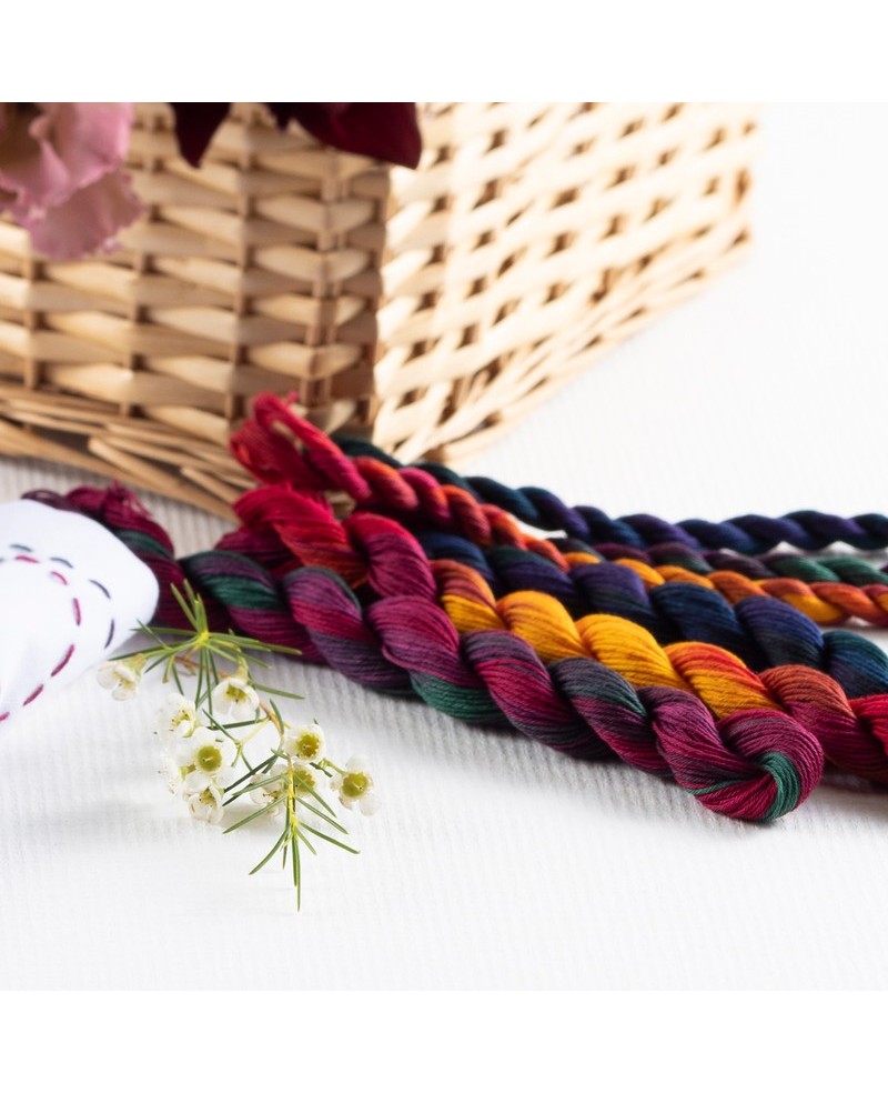 So-me Marche är ett japanskt system från Olympus för att färga sashikotråd hemma. Med startkittet lär du dig grunderna i stegfärgning, en teknik där tråden färgas i zoner för att skapa naturliga och slumpmässiga färgövergångar. Resultatet är unika flerfärgade härvor som ger liv och variation i varje stygn.