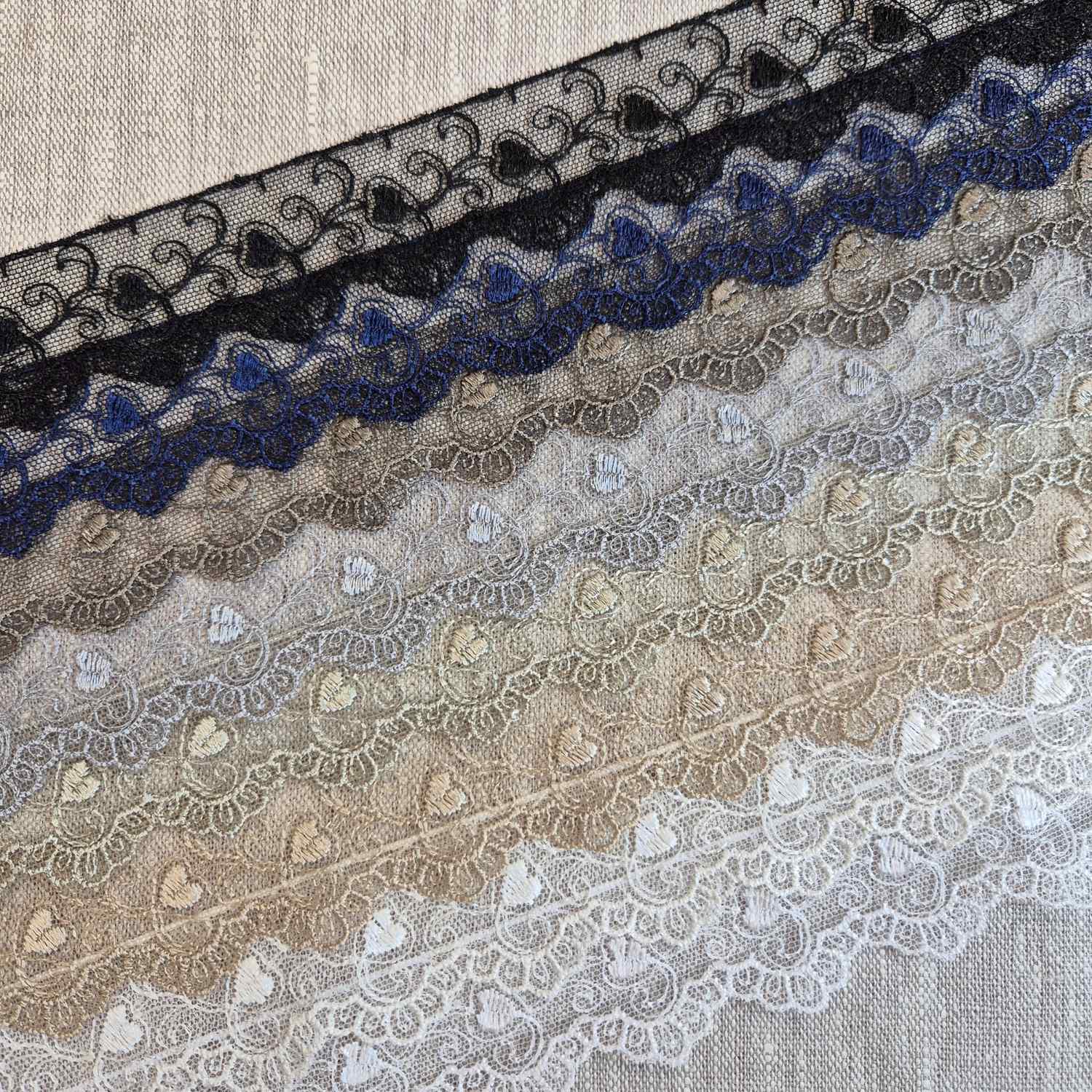 Spetsen är syntetisk och har ett hjärtmönster, vilket gör den lämplig för användning i kläder, accessoarer eller heminredning där en fin och delikat kant önskas.