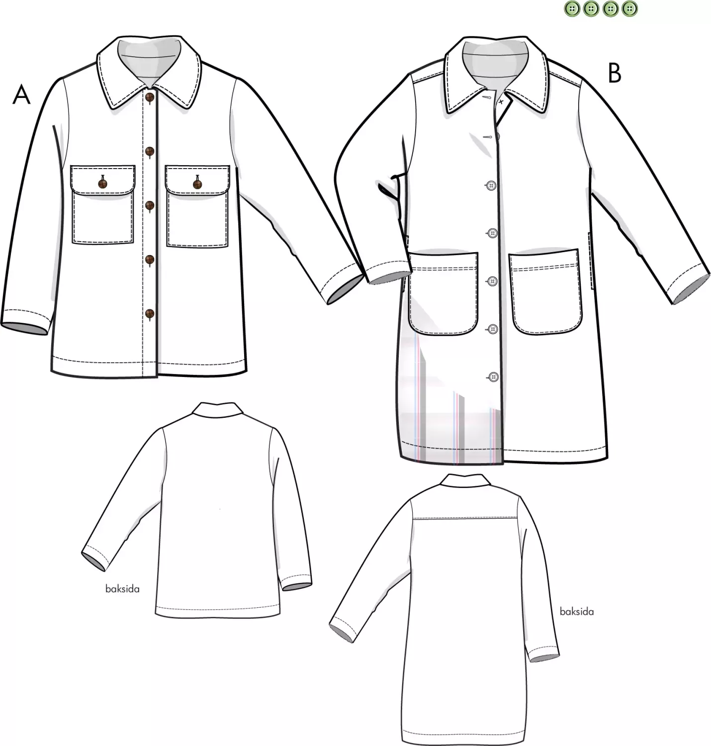 A: Jacka med bröstfickor med ficklock. Välj raka eller rundade fickor. Längd enligt mönstret ca 72 cm från axeln.