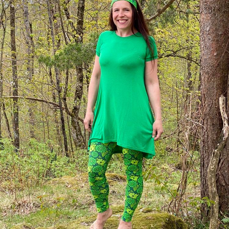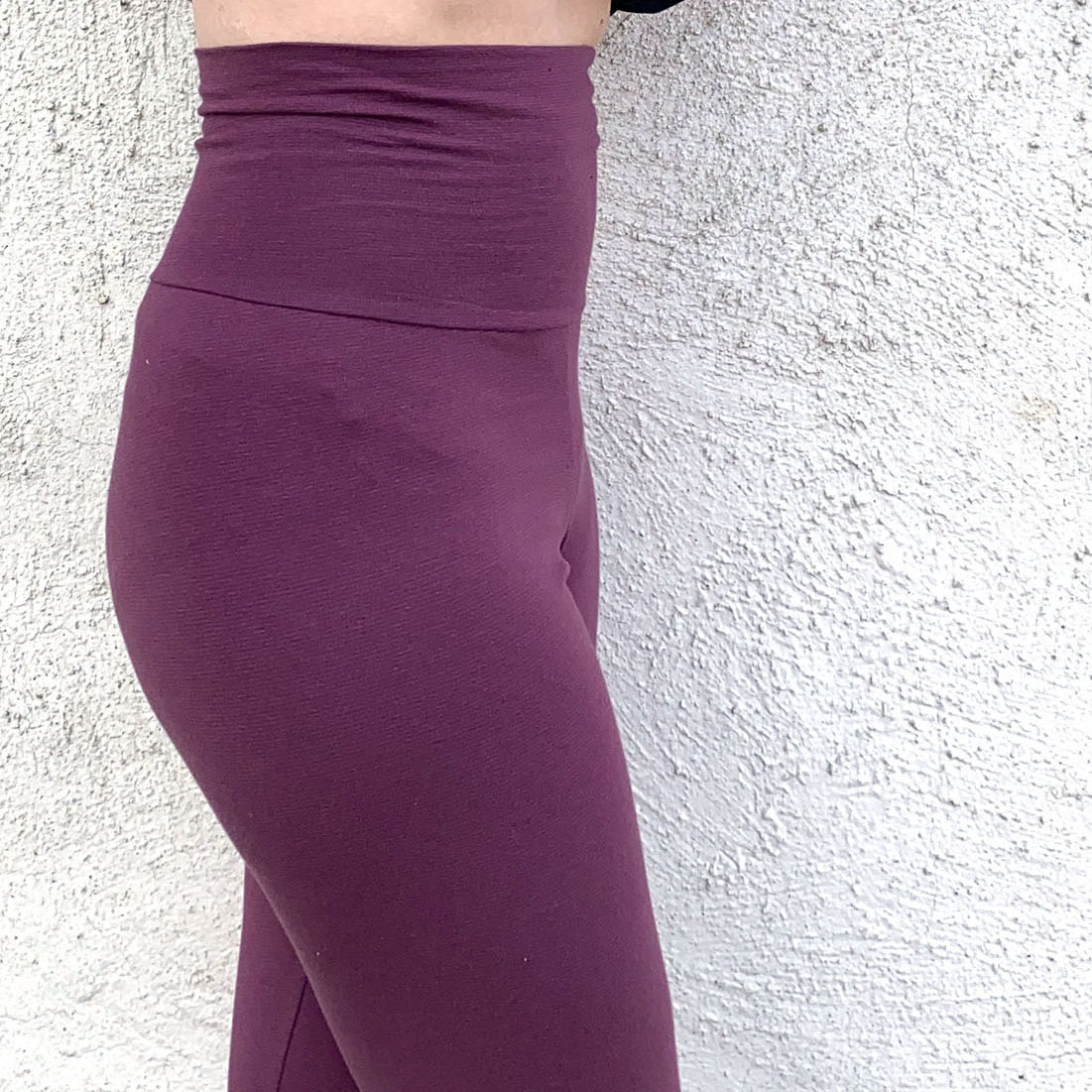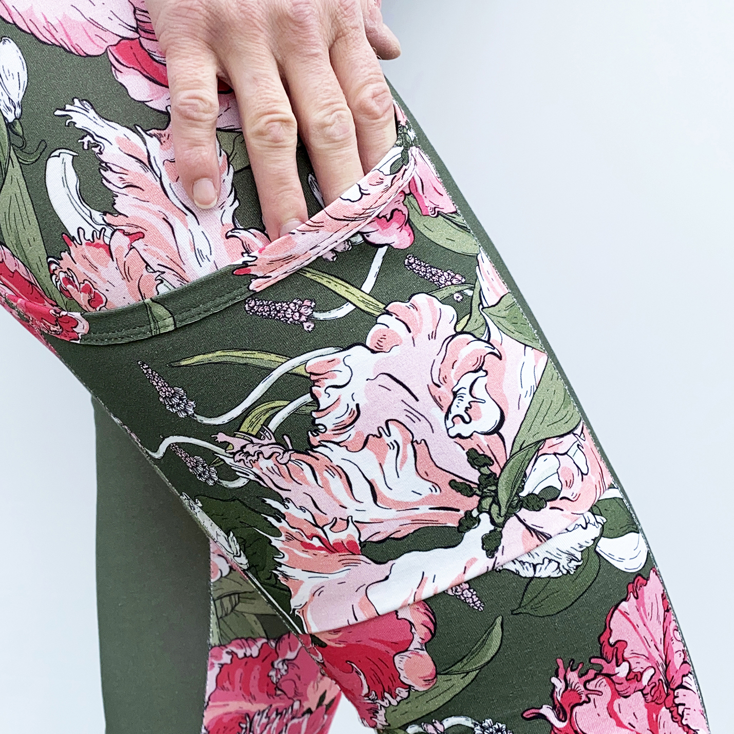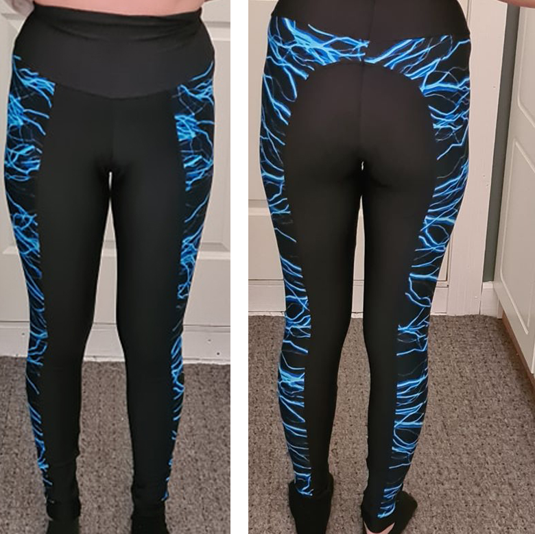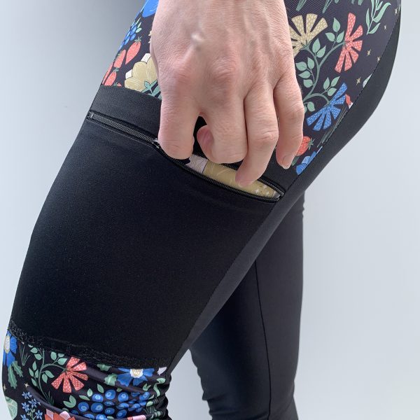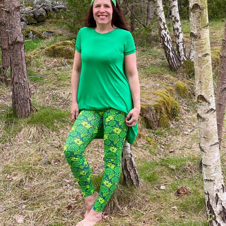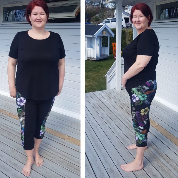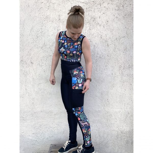 Välj mellan tre midjehöjder (låg, mellanhög och extra hög), fyra längder (shorts, capri, ankel och full längd) samt tre fickmodeller. Du kan också sy med hela eller delade mönsterdelar. Till yoga och vardagsbruk fungerar de flesta trikåtyger bra. Till mer intensiv träning rekommenderas sport lycra eller swim lycra.
