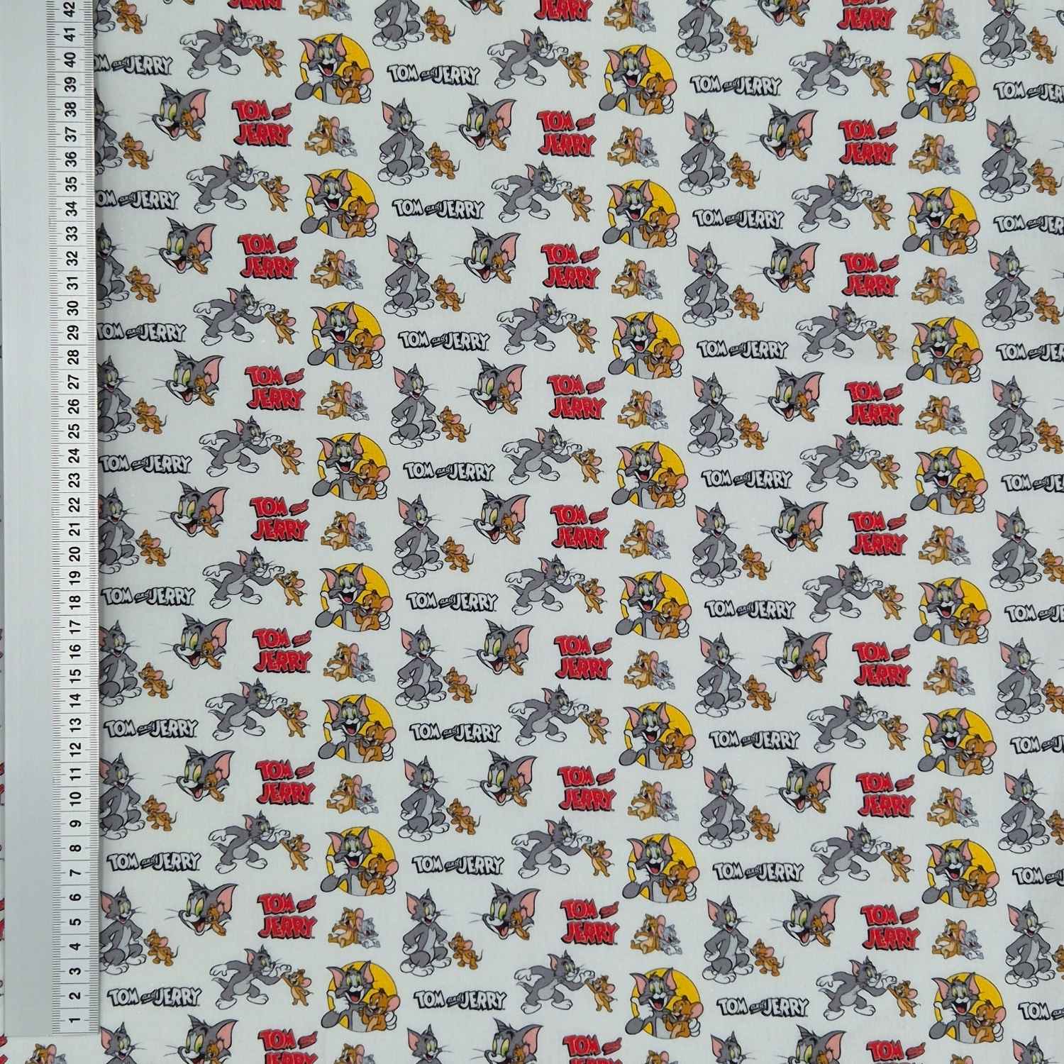Tom och Jerry-mönstrat bomullstyg! Detta vanliga vävda bomullstyg är tillverkat av 100% bomull och har en bredd på 150 cm, vilket gör det perfekt för olika syprojekt. Med en vikt på 120 g/m2 är det lätt och smidigt att arbeta med. Det lekfulla mönstret med Tom och Jerry på en vit bakgrund ger en nostalgisk och lekfull touch till dina skapelser.