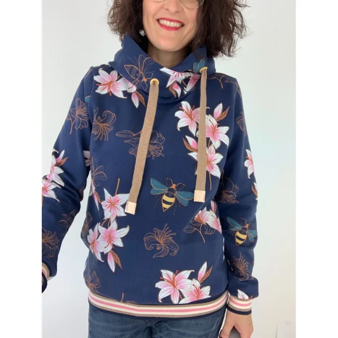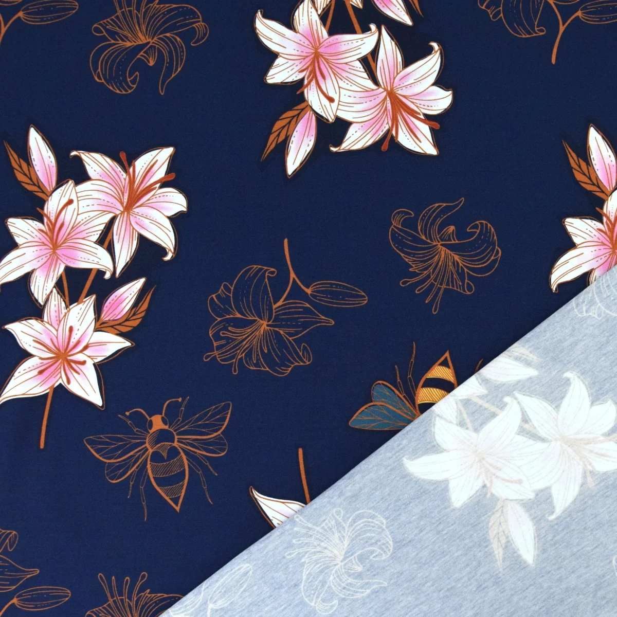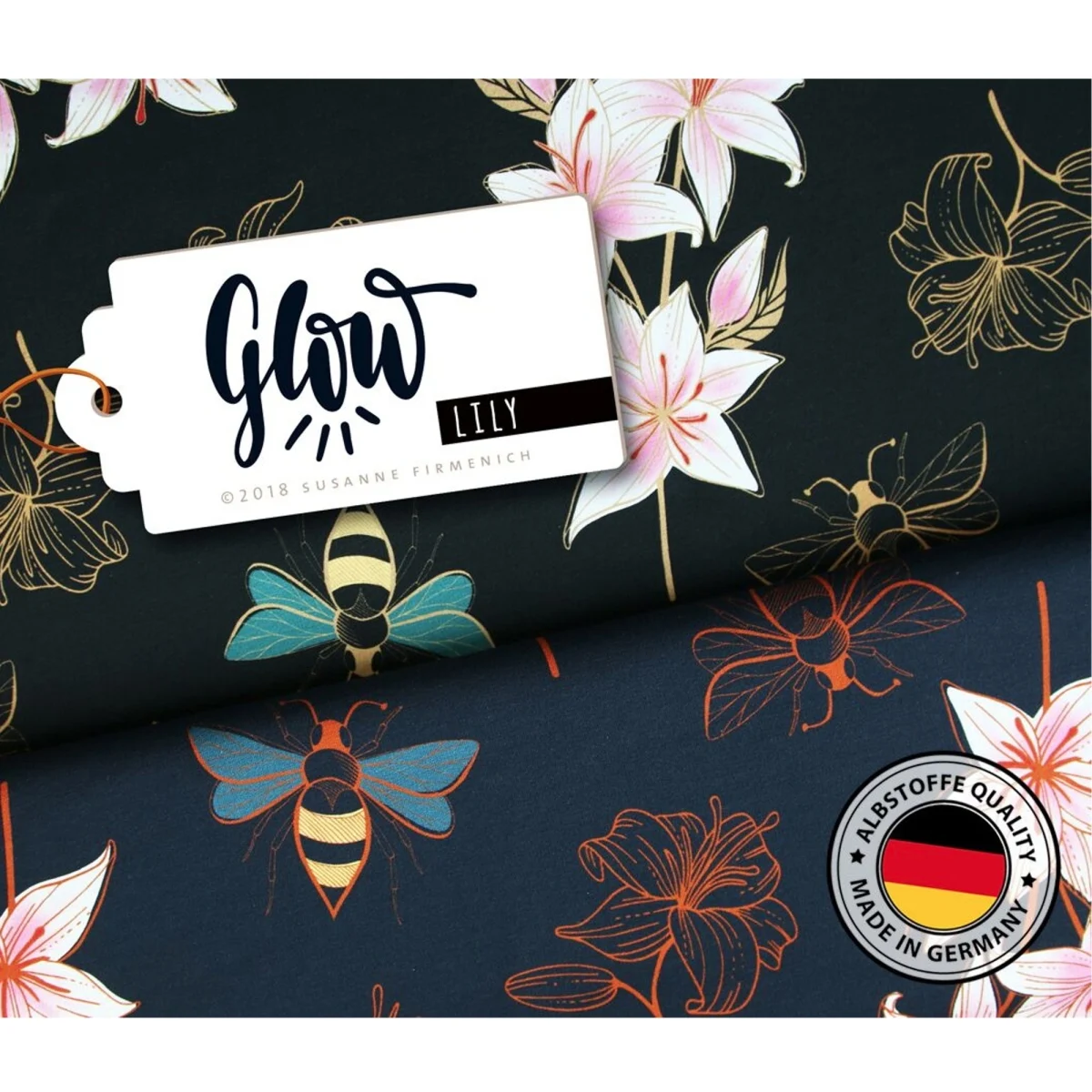 Glow Lily är ett digitaltryckt trikåtyg från tyska Albstoffe under designserien Hamburger Liebe. Mönstret föreställer rosa liljor och bin på en mörk botten, med detaljer i guld och koppar som ger djup åt motivet. Tyget är vävt i ekologisk bomull med inslag av elastan, vilket ger en mjuk hand och god återhämtning. Finns i två färgvarianter: marinblå och svart botten.