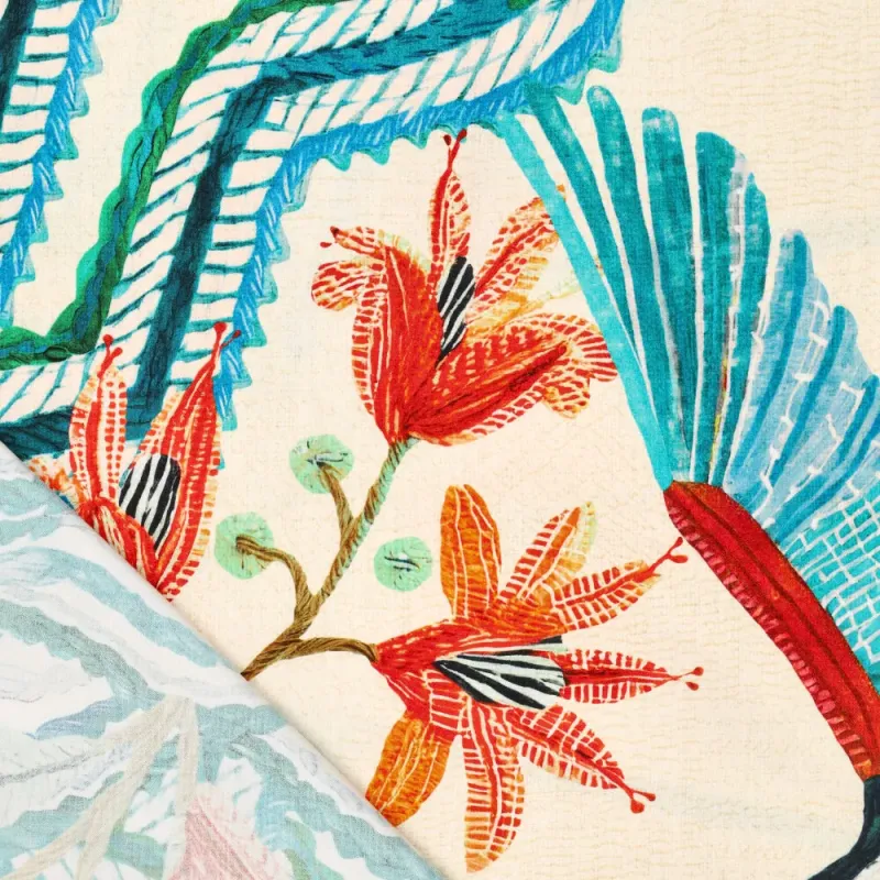 Ett mjukt och följsamt viskostyg med vackert fall och ett livfullt tropiskt mönster med tukaner och blad. Perfekt till klänningar, kjolar och blusar som ska röra sig lätt och kännas svala mot huden.