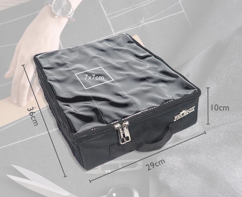 - Stor kapacitet: Väskan har 20 separata fack, vilket ger plats för trådrullar i olika färger och storlekar.