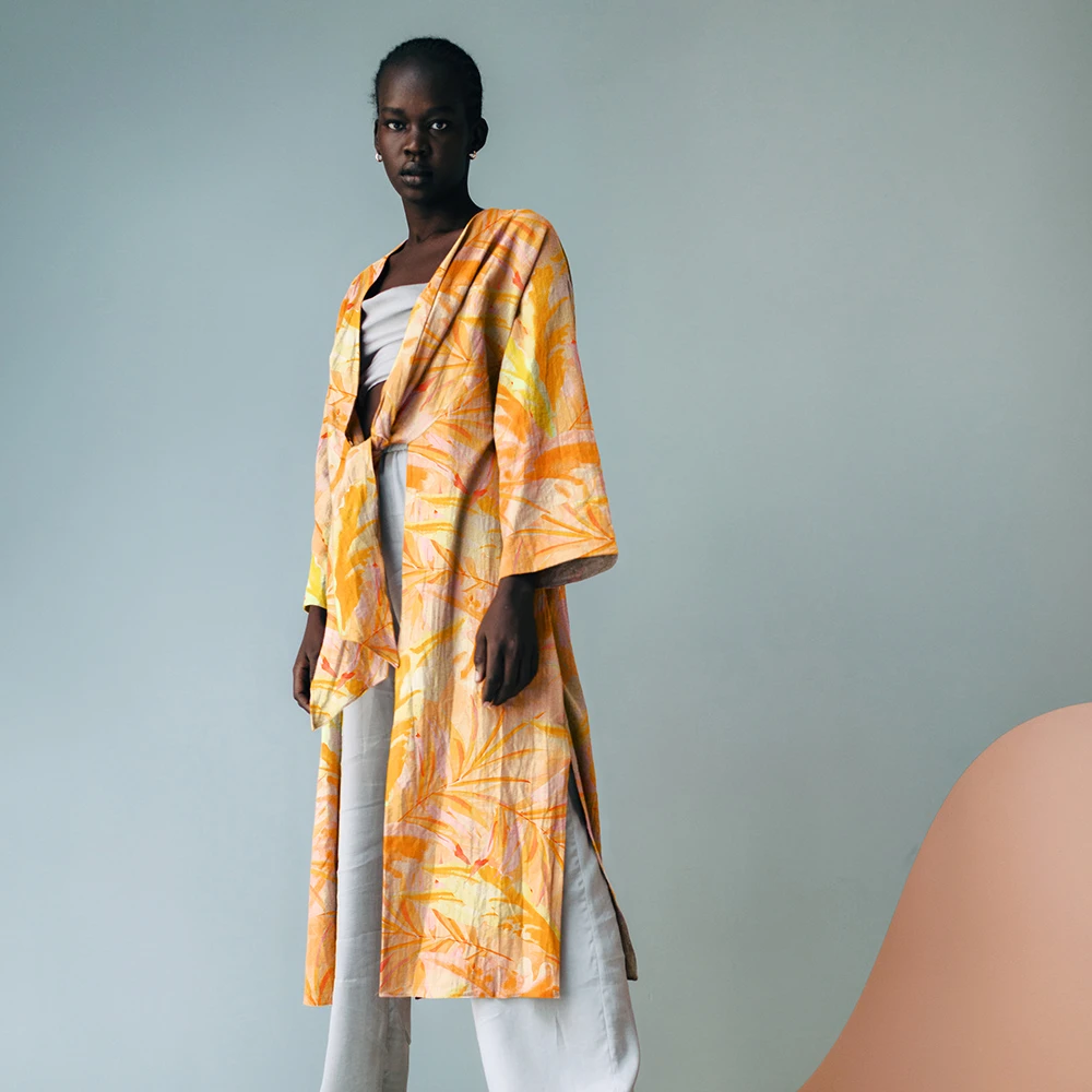 Ett luftigt och följsamt viskoslinne med ett levande digitaltryckt bladmotiv i varma toner av orange, gult och mjuk aprikos. Tyget kombinerar 80% viskos med 20% lin, vilket ger en mjuk känsla mot huden samtidigt som linnet tillför naturlig struktur och stadga.