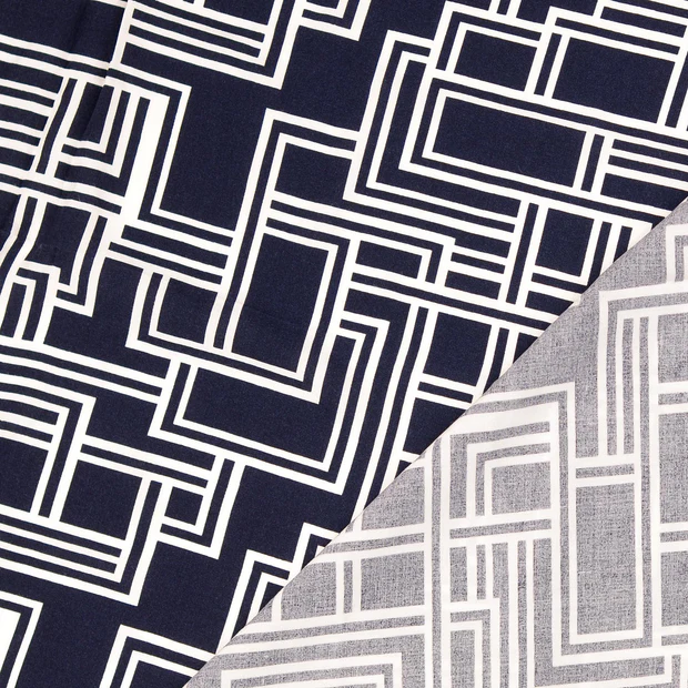 Ett elegant och luftigt viskostyg med ett grafiskt geometriskt mönster i marinblått och vitt. Tyget har ett vackert fall och en mjuk känsla som gör det perfekt för blusar, klänningar, tunikor och andra plagg där du vill ha en skön och följsam passform.